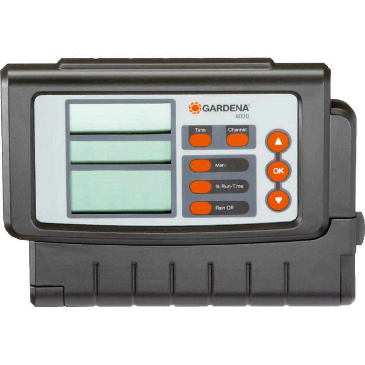 De GARDENA Classic Besproeiingscomputer 6030 wordt gebruikt voor de automatische regeling van grotere besproeiingssystemen, meestal verzonken besproeiingssystemen, zoals het GARDENA Sprinklersystem. De Classic Besproeiingscomputer 6030 is ideaal voor als de hoeveelheid water onvoldoende is voor een gelijktijdige werking van het volledige systeem – dat meestal uit meerdere besproeiingssystemen bestaat. Ook bij wisselende watervereisten voor afzonderlijke plantengebieden regelt dit systeem de individuele besproeiingsintervallen per kanaal, zodat er afzonderlijk en optimaal kan worden besproeid. De Classic Besproeiingscomputer 6030 is bedoeld voor aansluiting van maximaal zes beregeningsventielen van 24 V (1278-20). Voor een flexibele programmering van de besproeiing kunnen er maximaal drie programma’s per ventiel worden opgeslagen. De besproeiingsdagen en -cycli kunnen afzonderlijk worden geselecteerd. De besproeiingsduur kan worden ingesteld tussen 1 minuut en 3 uur 59 minuten en kan centraal worden ingesteld van 0 tot 200 %. Als de besproeiing meteen moet worden gestart, kan het systeem ook handmatig worden geactiveerd. Het grote en duidelijke display met instructies voor de gebruiker maakt het programmeren eenvoudig en intuïtief. Via het hoofdkanaal kan het GARDENA Pomprelais (1273-20) worden aangesloten, zodat een pomp als alternatieve watertoevoer kan worden geregeld. De GARDENA Classic Besproeiingscomputer 6030 kan binnen worden gebruikt, bijvoorbeeld in de garage, of op overdekte plekken, het systeem heeft een stroomaansluiting van 230 V. De besproeiingscomputer kan worden beveiligd tegen stroomuitval door middel van een alkalinebatterij van 9 V, zodat het systeem altijd betrouwbaar en veilig werkt (batterij niet meegeleverd). Waar nodig kan er een GARDENA Regensensor of Bodemvochtigheidssensor worden aangesloten voor een waterbesparende werking.