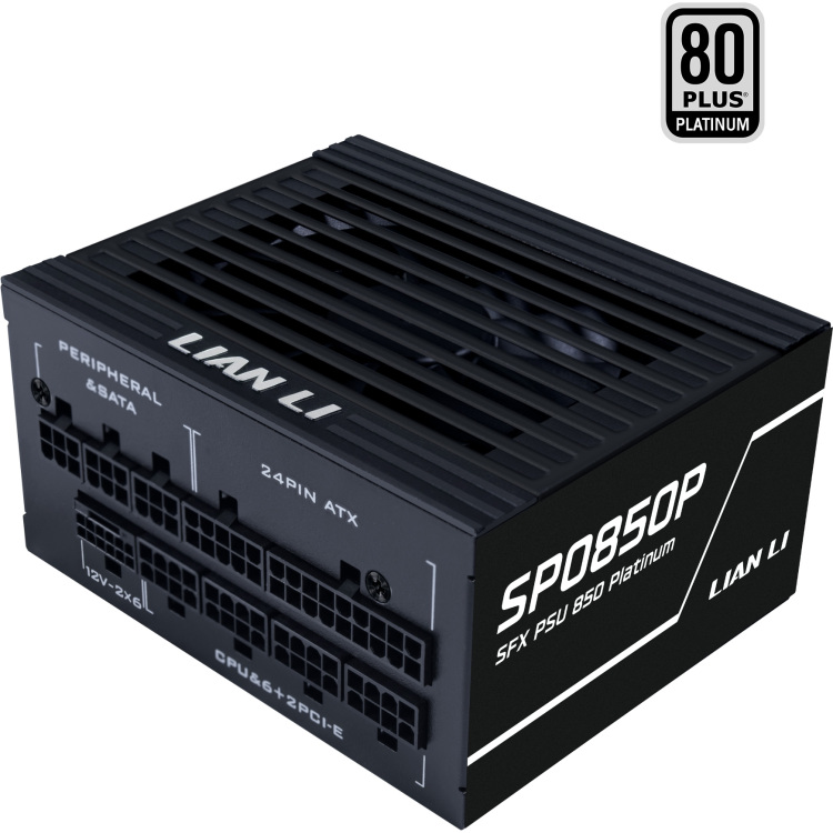 De zwarte Lian Li SP Platinum 850W is een SFX-voeding met standaardafmetingen van 125 mm (B) x 63,5 mm (H) x 100 mm (D), levert 80 PLUS® Platinum-efficiëntie tot 92% en voldoet aan de nieuwste Intel ATX 3.1- en PCIe 5.1-normen met interne 12V-2×6 legering van koper voor ondersteuning van de volgende generatie GPU’s. Het slimme koelingsontwerp maakt een stille, ventilatorloze werking mogelijk bij een belasting van ≤40%. De voeding is uitgerust met een C14 naar C13 netsnoer met een schakelaar die is ontworpen voor interne PSU-montage, superflexibele DC-kabels en een meegeleverde SFX-naar-ATX-beugel die zorgt voor eenvoudige, nette installaties. Compact van formaat maar krachtig, gebouwd met 100% Japanse 105°C condensatoren, volledige industriële bescherming en kan een volledige output aan bij 40°C.