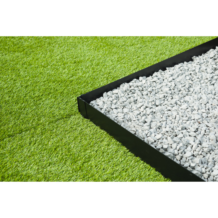 Borderrand van verzinkt staal in mat, zwart epoxy. Bestaande uit 3 aan elkaar te bevestigen latten met een hoogte van 10,2 cm en een lengte van 91,4 cm. De dunne, maar stevige rand met een dikte van 1,4 mm is geschikt voor rechthoekige en licht gebogen vormen. De onopvallende inkepingen zorgen ervoor dat de latten goed aan elkaar kunnen worden bevestigd en zo de gewenste lengte kan worden bereikt (onbeperkt aantal aan elkaar te bevestigen). Bij het bevestigen van de 3 latten in deze set is de totale lengte 2,64 m. Voor bevestiging in de grond zijn 4 pennen meegeleverd van 25 x 3,5 cm in dezelfde kleur als de rand. Deze dunne pennen dienen aan de bovenkant van de rand te worden bevestigd en kunnen vervolgens met een hamer in de grond worden geslagen. Ze zijn vrijwel onzichtbaar. De rand dient direct op de grond te worden geplaatst en vormt met zijn 10 cm hoogte een perfecte afbakening. Hij kan ook iets in de aarde worden gestoken als een lagere hoogte gewenst is. Deze rand geeft de tuin een luxueuze uitstraling als afbakening van paden, borders, etc. De matte afwerking weerspiegelt zonnestralen niet en de fijne dikte is bestand tegen schokken en verdraaiing. De niet-opgerolde randen zijn recht en afgerond om het risico op snijwonden te voorkomen.