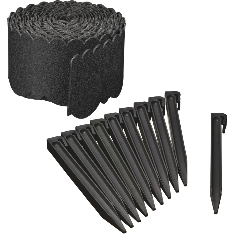 Complete borderrandset bestaande uit een decoratieve borderrand van zwart gerecycled PE en een set grondpennen van gerecycled PP. De grondpennen zijn vast te zetten in de inkepingen van de borderrand. Ideaal voor het aanleggen van tuinpaden, het afbakenen van moestuinen, grasperken, borders of als rand rondom een vijver. De zwarte decoratieve borderrand heeft een dikte van 3 mm, een lengte van 12 m en een hoogte van 13 cm.