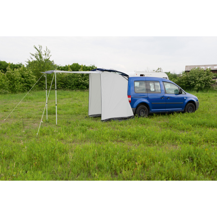 De zeer compacte Achtertent verticaal, zonder stokken van Reimo is snel en eenvoudig op te zetten. De tent wordt onder de achterklep gemonteerd met de bevestigde riemen. Klittenband en de afdichting van de carrosserie maken hem vrijwel waterdicht. De achterwand kan als deur of als zonwering worden opgesteld. Het dakraam in het dak maakt het mogelijk om het interieur te verlichten, zelfs als de deur gesloten is. Deze achtertent is perfect als uitbreiding van de ruimte in de minicamper of als douche- of kleedruiimte. Er zijn geen stokken nodig.