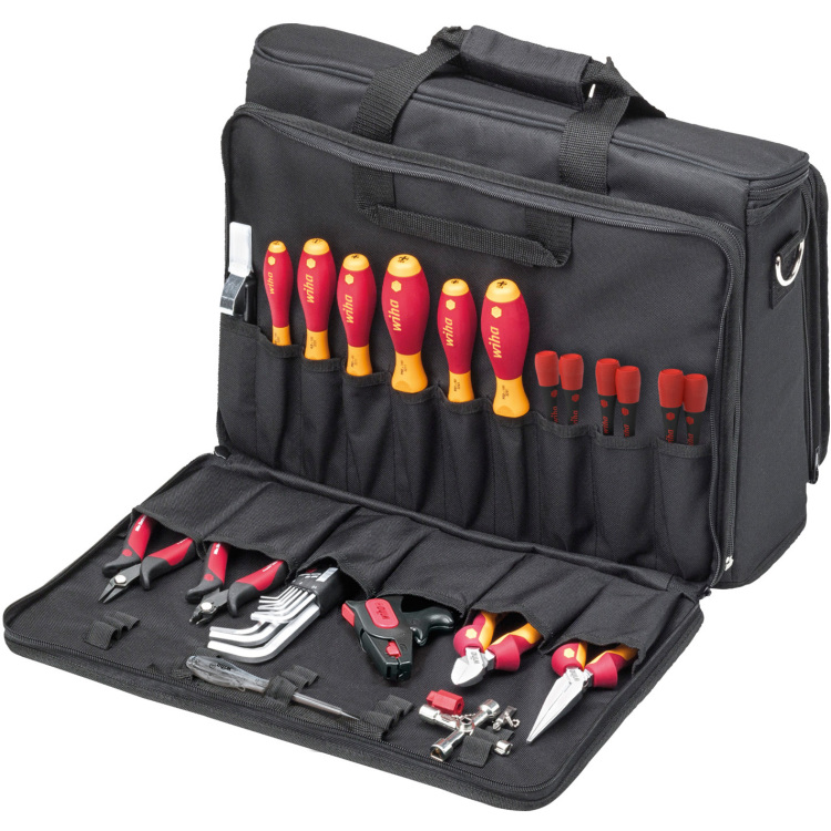 De servicemonteur gereedschapstas van Wiha bevat geselecteerde basisuitrusting voor de servicemonteur. Dit betekent dat je altijd het juiste gereedschap bij de hand hebt voor de meest voorkomende reparaties. Ergonomische, volledig geïsoleerde schroevendraaiers uit de Wiha slim-familie, elektronische schroevendraaiers, tangen en andere gereedschappen maken het dagelijkse werk merkbaar eenvoudiger.De kleine Wiha schroevendraaiers zorgen voor een goede en beschermde toegang tot diep liggende schroeven. Tegelijkertijd beschermen de gereedschappen, die volledig geïsoleerd zijn volgens VDE, de gebruiker bij het werken aan onderdelen onder spanning. De gecombineerde laptop- tooltas is ideaal voor onderhoudstechnici. Hij kan volledig worden geopend, gesloten met een rits en biedt verschillende vakken voor handgereedschap, laptop en documenten. Bovendien is er voldoende ruimte voor individuele extra apparatuur. Het zijvak voor gereedschap is door middel van de rits los te maken van het laptopvak en kan apart worden gebruikt. De laptoptas is geschikt voor alle gangbare laptops.