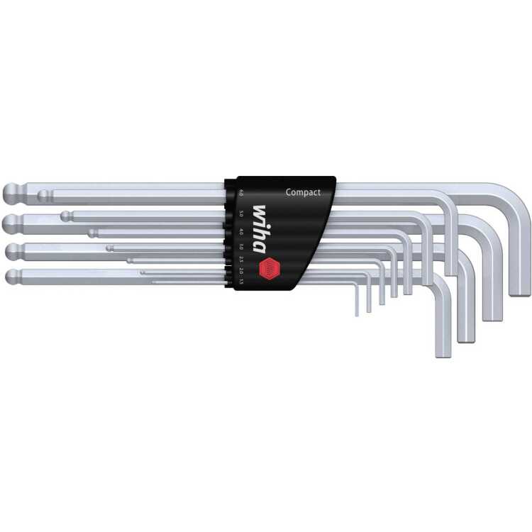 De Wiha 36453 inbussleutels in de Compact houder zijn gemaakt van chroom vanadium staal, door en door gehard en mat verchroomd. Zij zijn geschikt voor moeilijk bereikbare schroeven en kunnen met weinig moeite hoge draaimomenten overbrengen. De kogelkop aan de lange zijde van de haakse inbussleutels maakt het mogelijk schuin te schroeven met een hoek tot 25°. Dankzij zijn compacte vorm past de houder perfect in elke zak van de duimstok.